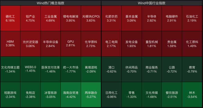 从板块看,大科技回归,半导体芯片领涨,CPO、存储芯片、锂电电解液等概念板块走强。磷化工概念股活跃,电脑硬件、石油化工、贵金属等板块纷纷上涨;而近日涨幅较大的冰雪旅游、两岸融合、海南自贸区概念板块明显回调,餐饮旅游、零售等消费板块走弱。