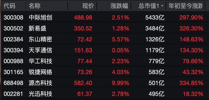 CPO板块走强,“易中天”股价拉升。截至午盘,中际旭创、新易盛、天孚通信涨幅分别为2.51%、1.28%、0.05%。