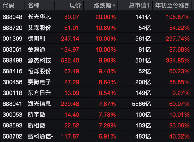 个股方面,长光华芯录得20cm涨停,德明利、金海通录得10cm涨停。中芯国际涨近4%,海光信息涨超7%,源杰科技、艾森股份、赛微电子、东方日升跟涨。