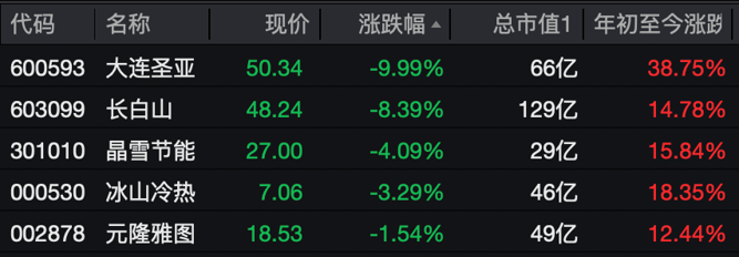 冰雪产业板块集体调整,大连圣亚跌停,长白山、凯撒旅业、晶雪节能跟跌。