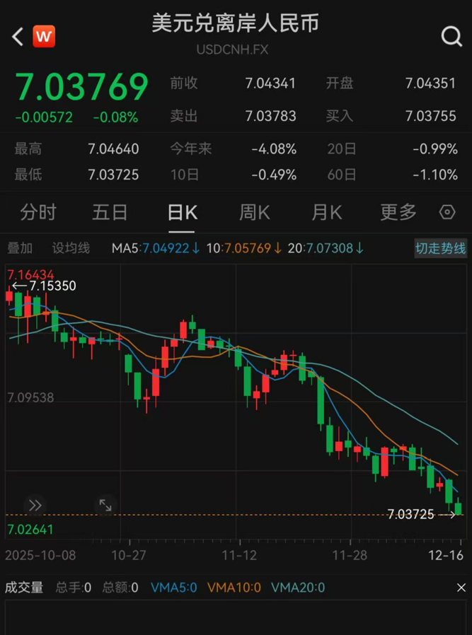 其中,离岸人民币对美元汇率再次击穿7.04,盘中一度升至7.03725,创2024年10月4日以来新高,截至发稿,报7.03769。