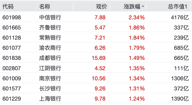 银行股方面,中信银行涨超2%,建设银行、中国银行涨超1%,农业银行、邮储银行、交通银行等跟涨。