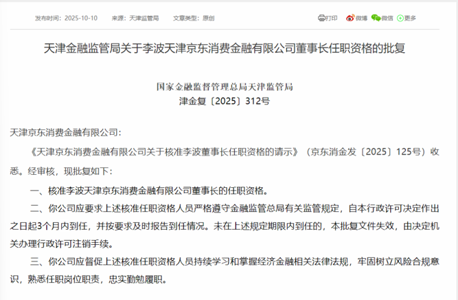 10月10日,天津金融监管局批复公告称,核准李波天津京东消费金融有限公司(以下简称京东消金)董事长的任职资格。