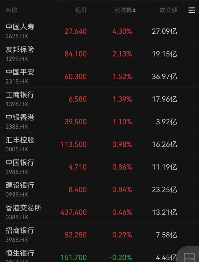 红利板块表现亮眼,内银股、保险股、石油股集体上涨。