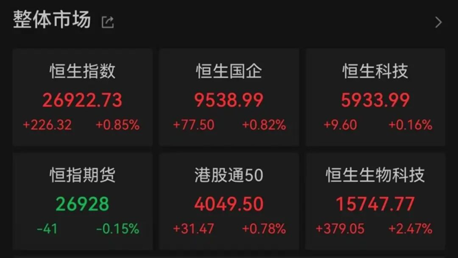 截至收盘,恒生指数上涨0.85%,报26922.73点;恒生科技指数上涨0.16%,报5933.99点;恒生国企指数上涨0.82%,报9538.99点。盘面上,大型科技股涨跌不一,金融股、医药股、家电股、石油股集体活跃。