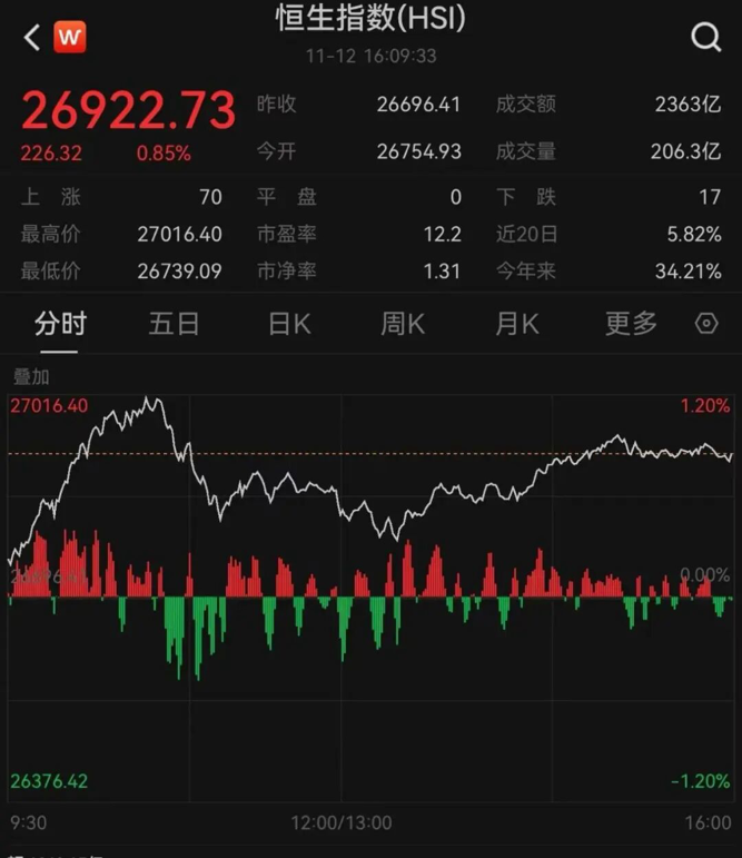 11月12日,港股三大指数集体收涨,恒生指数和恒生国企指数盘中一度冲高,恒指一度站上27000点大关。