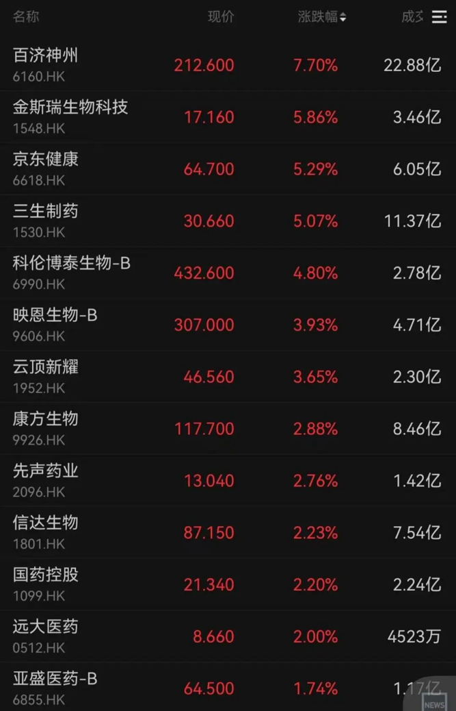 百济神州涨超7%,金斯瑞生物科技、京东健康和三生制药分别上涨5.86%、5.29%、5.07%。