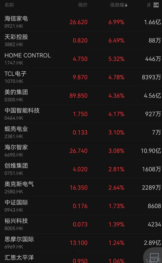 海信家电、TCL电子、美的集团和海尔智家分别上涨6.99%、4.78%、4.36%、3.08%。