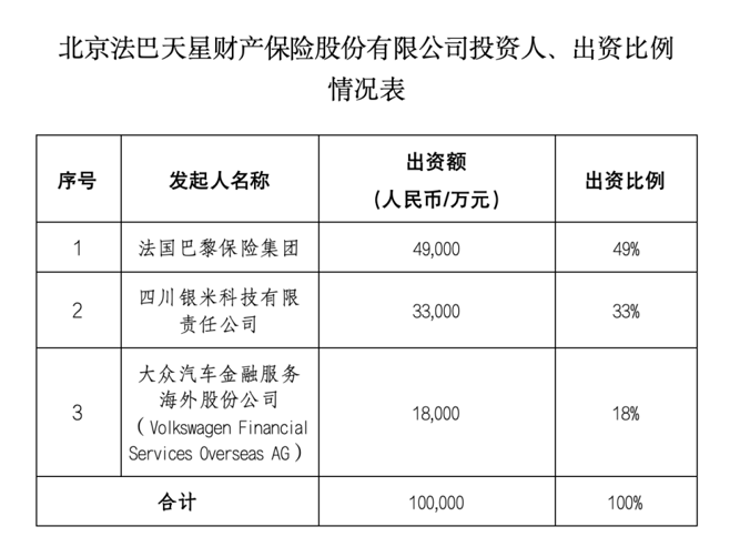 此外,法巴天星财险注册资本为10亿元。股东方面,法国巴黎保险集团、四川银米科技有限责任公司(以下简称银米科技)、大众汽车金融服务海外股份公司持股比例分别为49%、33%、18%。