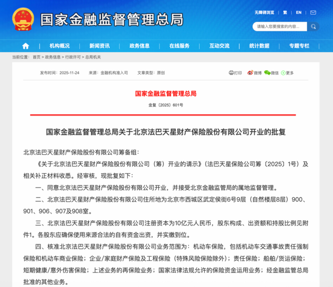 11月24日,金融监管总局官网信息显示,北京法巴天星财产保险股份有限公司(以下简称法巴天星财险)已于10月17日获准开业。