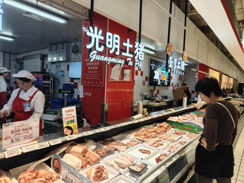 在大润发超市挑选猪肉的消费者(夏天摄)