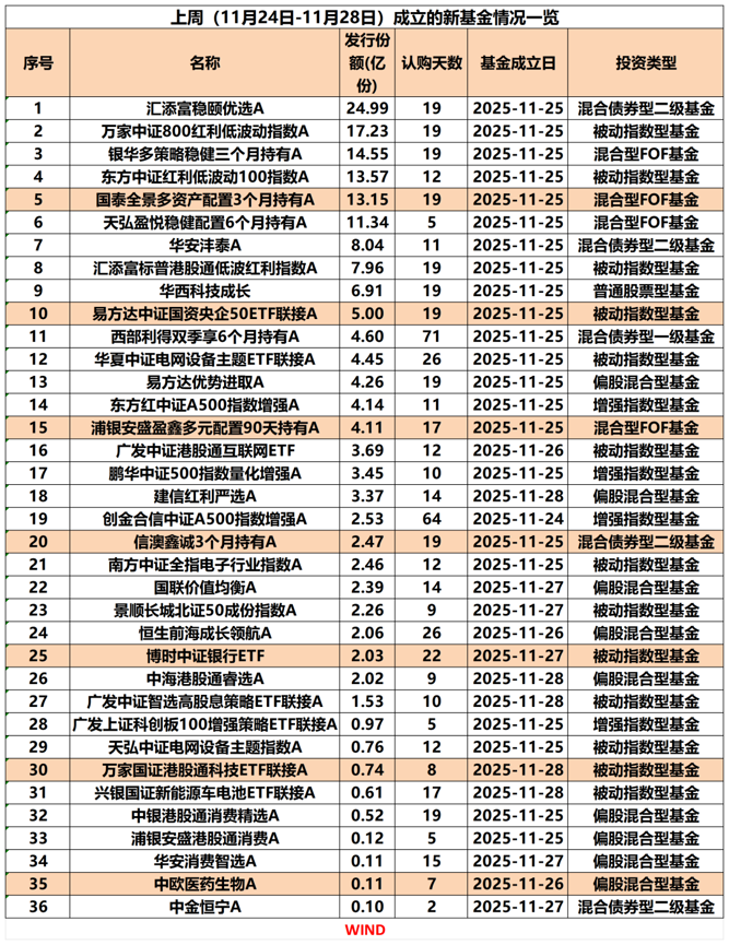 “固收+”产品方面,汇添富稳颐优选于11月25日正式成立,首募规模为24.98亿元。华安沣泰A募集规模超8亿元。