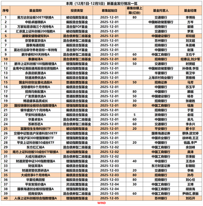 本周(12月1日至12月5日),全市场共有40只新基金(仅统计主代码)面市,12月首日,就有28只新基金“同台竞技”。其中,主动权益型基金和指数型基金成为发行主力。