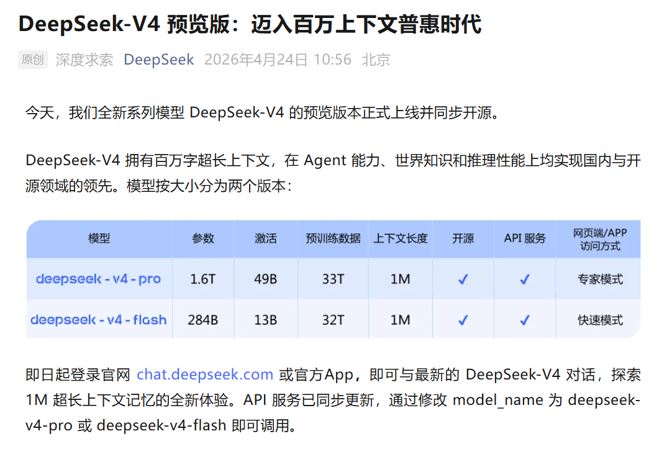 DeepSeek-V4针对Claude Code、OpenClaw、OpenCode、CodeBuddy 等主流的Agent产品进行了适配和优化,在代码任务、文档生成任务等方面表现均有提升。