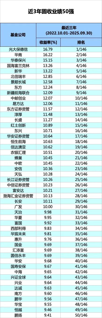 最近3年债券市场呈现宽幅震荡格局,也是考验基金公司固收投资能力的一个关键区间。数据显示,在2022年10月1日至2025年9月30日之间,有30家基金公司固收类产品净值增长率达到10%以上。