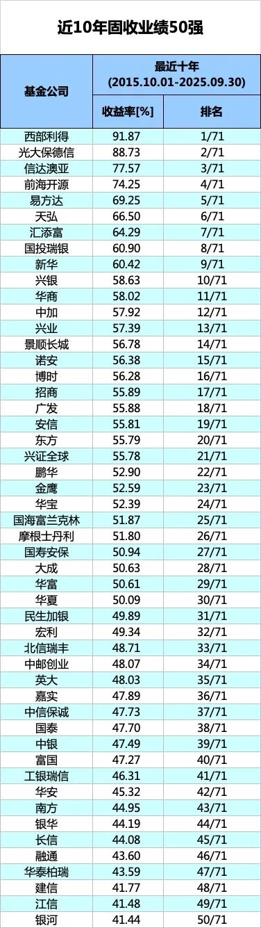 国泰海通证券数据显示,2015年10月1日至2025年9月30日的10年间,收益率在71家基金公司中位居首位的是西部利得基金,该公司最近10年的收益率达到91.87%。紧随其后的是光大保德信基金,最近10年固收类产品收益率达到88.73%,仅这两家公司10年收益率超过80%。信达澳亚、前海开源基金最近10年的收益率分别达77.57%、74.25%,位列第三名和第四名。