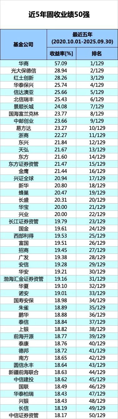 数据显示,在固收类基金最近5年(2020年10月1日至2025年9月30日)净值增长排行榜中,华商基金在129家可比公司中表现最为优异,净值增长率达57.09%。