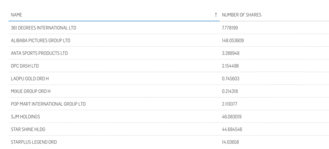 截至目前,指数成份股包括361度国际、阿里影业、安踏体育、达美乐披萨、老铺黄金、蜜雪冰城、泡泡玛特、澳博控股、应星控股、巨星传奇等。