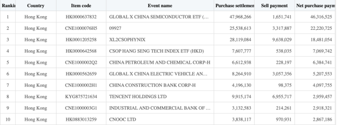 港股方面,过去一个月(10月25日—11月24日),韩国股民净买入较多的个股或ETF包括:Global X 半导体ETF、赛力斯、南方东英SK海力士每日杠杆(2X)产品、南方东英恒生科技指数ETF、中国石化、Global X 中国电动车和电池ETF、建设银行、腾讯控股、工商银行、中国海洋石油有限公司等,其中,净买入Global X 半导体ETF的金额为4631.65万美元。