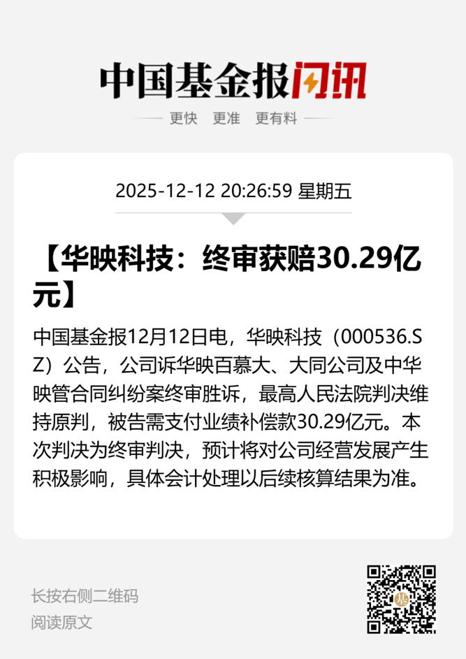12月12日晚间,华映科技公告称,公司诉华映百慕大、大同公司及中华映管合同纠纷案终审胜诉,最高人民法院判决维持原判,被告需支付业绩补偿款30.29亿元。