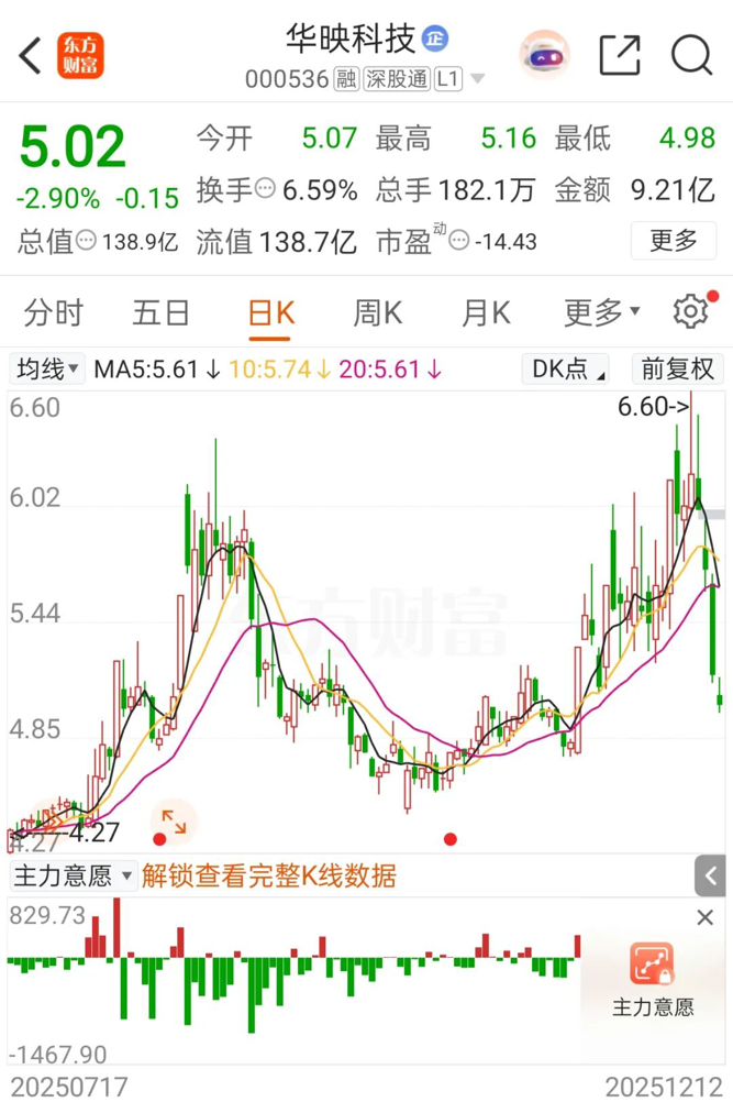 截至12月12日,华映科技报5.02元/股,下跌2.90%,总市值为139亿元。
