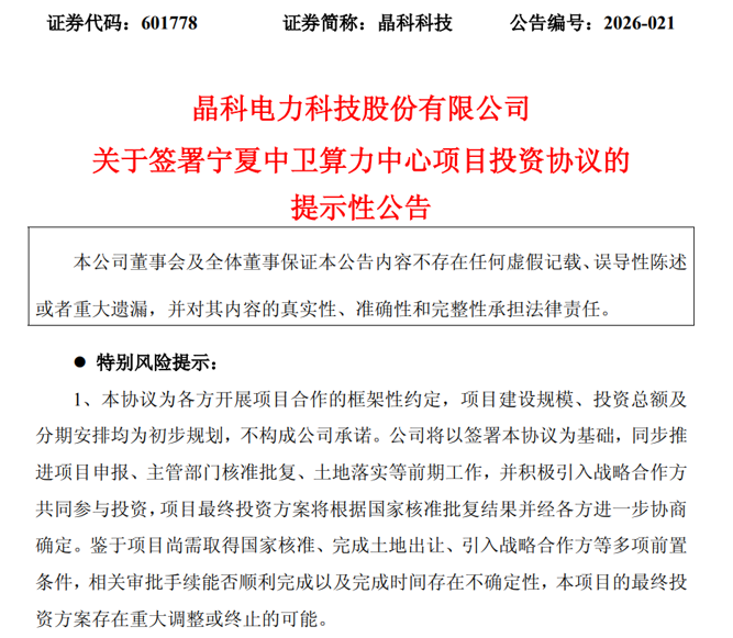 4月16日晚间,晶科科技发布关于签署宁夏中卫算力中心项目投资协议的提示性公告。