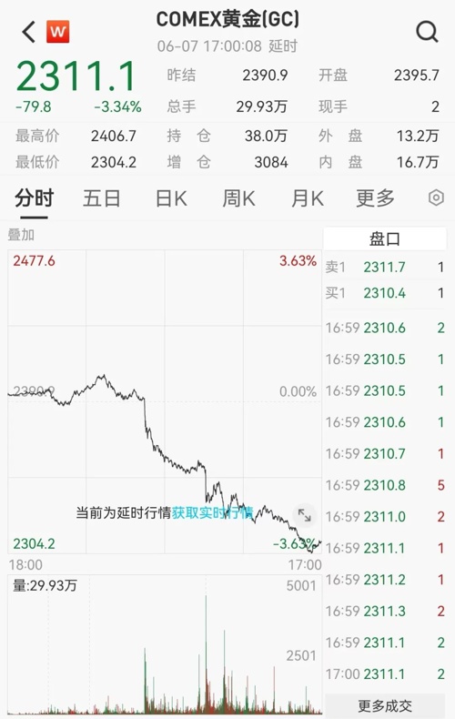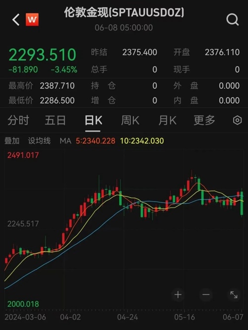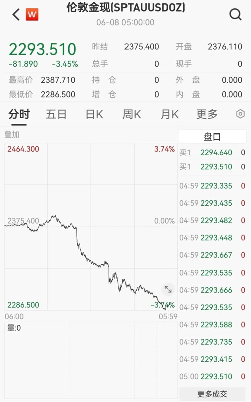 当地时间6月7日,现货黄金一度跌破2900美元大关。伦敦现货金2286.50美元/盎司。最新报价为2293.51美元/盎司,跌幅达3.45%。