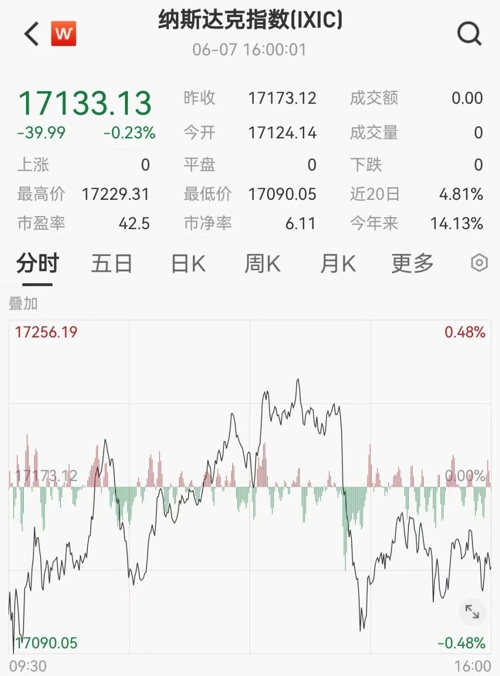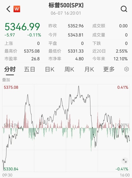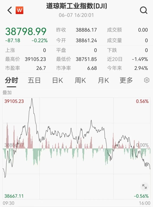 美东时间6月7日,美国三大股指小幅收跌。截至收盘,道指跌0.22%,报38798.99点;标普500指数跌0.11%,报5346.99点;纳指跌0.23%,报17133.13点。本周,道指涨0.29%,标普500指数涨1.32%,纳指涨2.38%。