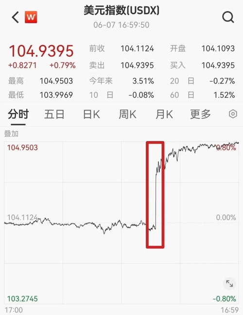 就业数据公布后,美元指数跳升。纽约尾盘,美元指数涨0.79%,报104.9395。