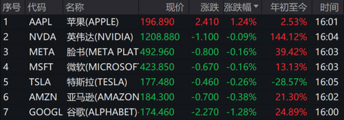 科技股七巨头中,只有苹果收涨,涨幅为1.24%。