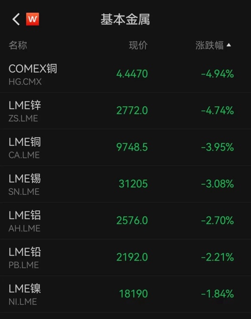 伦敦基本金属全线收跌。LME期铜跌3.95%,报9748.5美元/吨,周跌2.9%;LME期锌跌4.74%,报2772美元/吨,周跌6.65%;LME期镍跌1.84%,报18190美元/吨,周跌7.71%;LME期铝跌2.7%,报2576美元/吨,周跌2.88%;LME期锡跌3.08%,报31205美元/吨,周跌5.56%;LME期铅跌2.21%,报2192美元/吨,周跌3.56%。