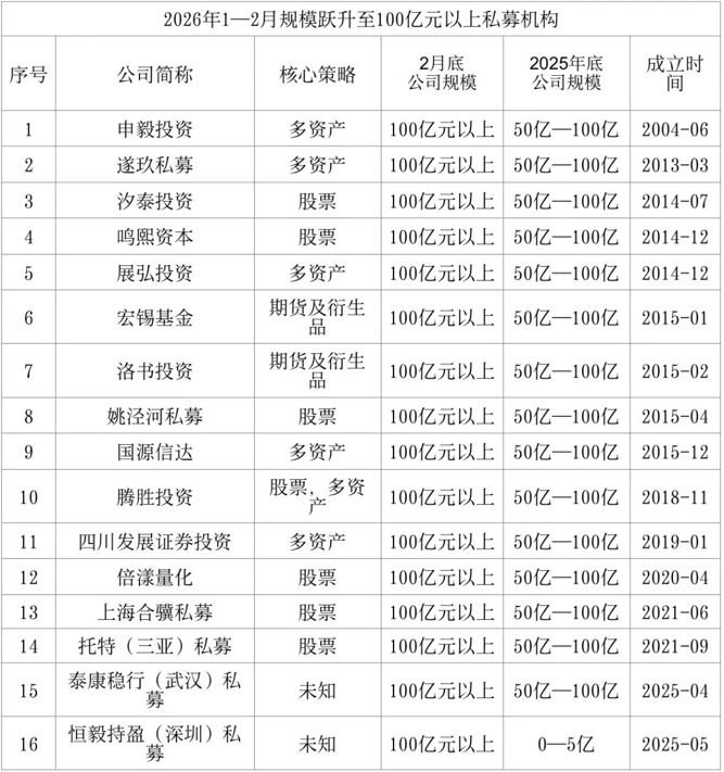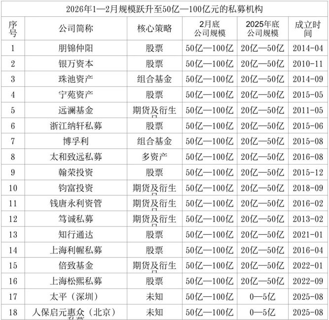 在头部阵营扩容的同时,私募行业中型梯队也显著壮大。数据显示,2026年1—2月,共有18家私募机构管理规模跃升至50亿—100亿元区间。