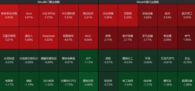 从板块来看,AI应用方向集体走强,文化传媒、互联网、软件等板块拉升,医疗保健、贵金属、航天军工等板块涨幅居前;而能源设备、锂电、储能等板块跌幅居前。