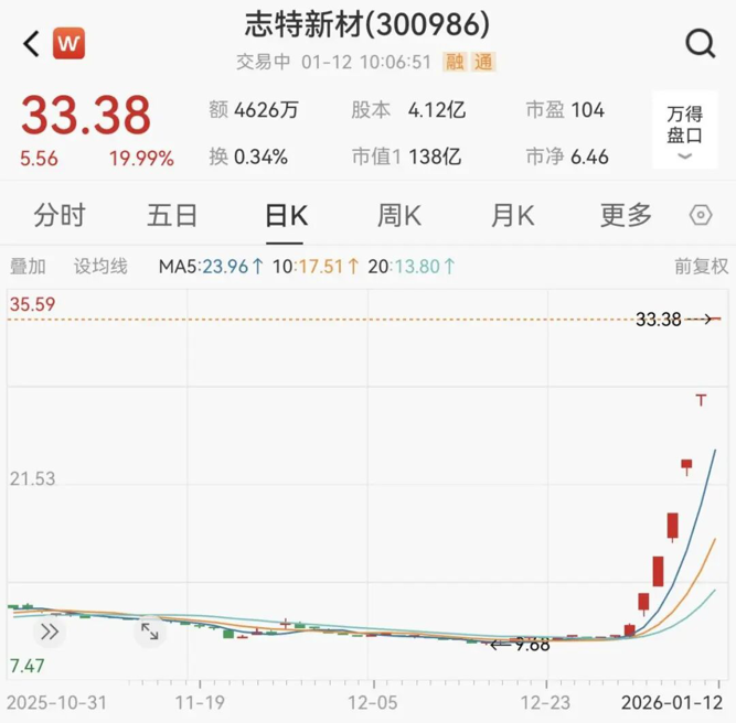 1月12日,志特新材再度20%涨停,实现6连板。1月5日以来,志特新材6个交易日累计大涨199%。