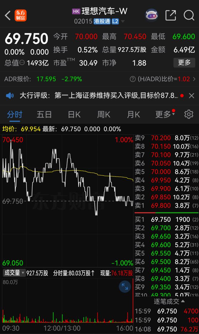 截至12月3日收盘,理想汽车港股股价报69.75港元/股,总市值为1493亿港元。
