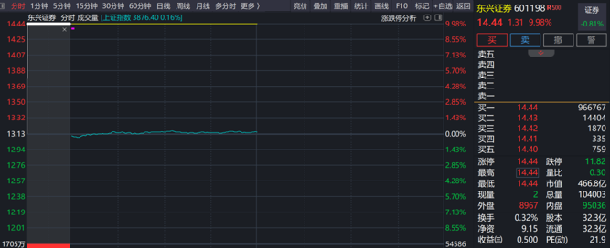 12月18日,中金公司公布拟吸收合并东兴证券与信达证券预案并复牌,市场给予了积极回应。中金公司、东兴证券A股开盘同步涨停,信达证券A股开盘涨6.8%。截至午间收盘,中金公司上涨5.04%,东兴证券封住涨停,信达证券上涨4.55%,领涨证券板块。