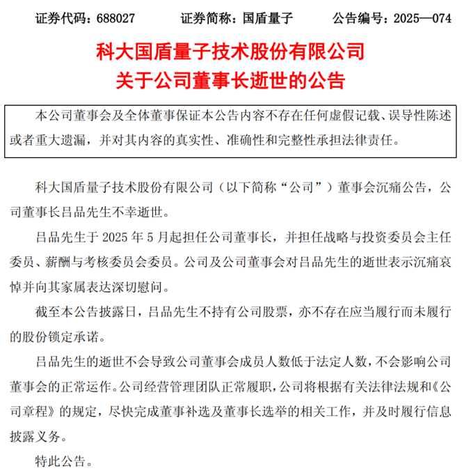 另外,12月18日晚间,合肥市公安局高新技术开发区分局发布警情通报:2025年12月18日13时许,我局接报警称,吕某(男,46岁)在望江西路与孔雀台路交口某公司一办公室内失去意识。接警后,民警立即到场处置。经120现场确认,吕某已无生命体征。经公安机关勘查调查,已排除案件。据悉,通报中提到的吕某即为国盾量子董事长吕品。