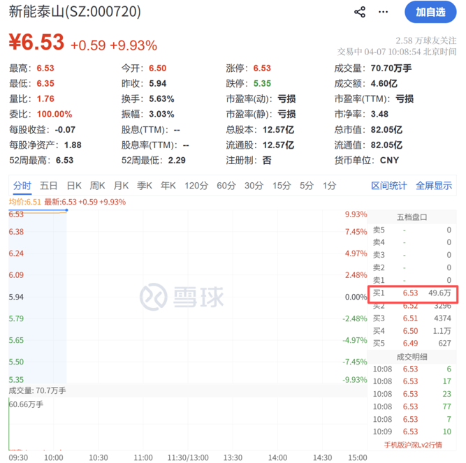 4月7日,新能泰山开盘即遭大量资金涌入,3秒钟封住涨停板,走出“10日8板”。截至发稿,新能泰山报6.53元/股,涨幅为9.93%,买一近50万手。