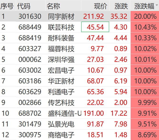 4月7日,A股电子板块盘初走强,电路板、覆铜板、OLED等方向火热。个股方面,同宇新材开盘2分钟走出20cm涨停,传艺科技、宏昌电子、利通电子等纷纷涨停。国金证券研报称,看好AI覆铜板/PCB及核心算力硬件、半导体设备及苹果产业链。AI强劲需求带动PCB价量齐升,目前多家AI-PCB公司订单强劲,满产满销,正在大力扩产,业绩高增长有望持续。AI覆铜板也需求旺盛,由于海外覆铜板扩产缓慢,大陆覆铜板龙头厂商有望受益。消息面上,近期产业链人士透露,富士康已在试产苹果折叠屏iPhone。此前,苹果给供应商提供的出货目标指引为2026年下半年推出首款折叠屏手机,是一款大折叠屏iPhone。市场调查机构Counterpoint Research近日在报告中指出,受苹果公司预期进入折叠屏智能手机、产品持续高端化以及OEM厂商参与度不断提高的推动,预计到2026年,全球折叠屏智能手机出货量将增长20%。在高端智能手机市场中,随着厂商不断提升设备耐用性并优化大屏显示下的软件体验,折叠屏手机也正逐步确立其地位。化工板块猛涨
