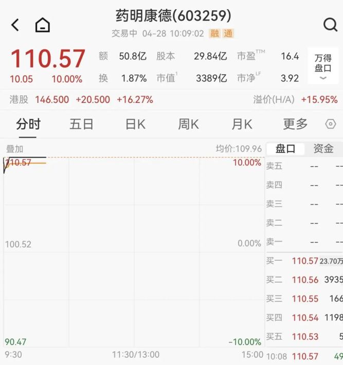 消息面上,4月27日晚间,药明康德披露2026年一季报,公司实现营业收入124.36亿元,同比增长28.81%,一季度营收首次超越百亿元;实现归母净利润46.52亿元,同比增长26.68%。营业收入、归母净利润均创下历史同期新高。