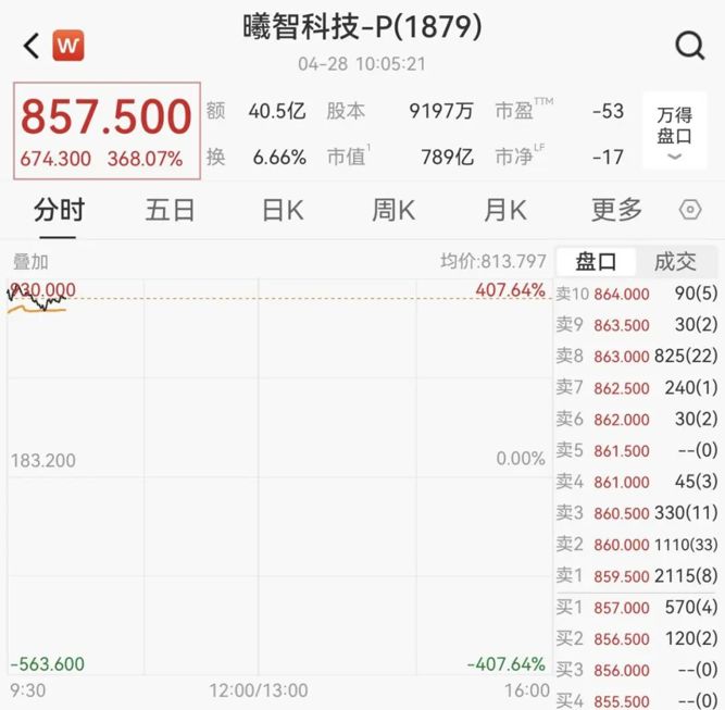 4月28日,曦智科技正式登陆港交所,成为全球“AI光算力第一股”。曦智科技开盘大涨超380%,截至发稿,报857.5港元/股,总市值为789亿港元。