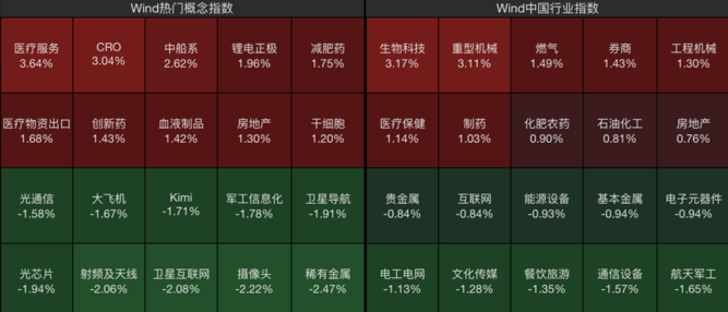 板块上来看,生物医药板块集体走高,燃气、券商、工程机械等板块表现活跃;而航天军工、通信设备、光芯片等板块跌幅居前。