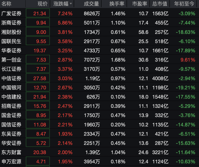 A股证券板块震荡走高,广发证券涨超7%,浙商证券、湘财股份、国联民生等涨幅居前。