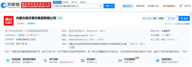 天眼查信息显示,西贝关联公司内蒙古西贝餐饮集团有限公司成立于2017年10月,法定代表人为贾国龙,注册资本约8990万元。对外投资信息显示,该公司直接持股189家企业,其中,150余家企业为存续状态,30余家企业已注销。