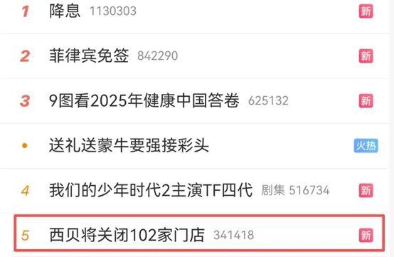 1月15日,“西贝将关闭102家门店”的词条登上微博热搜榜,且关注度持续提升。