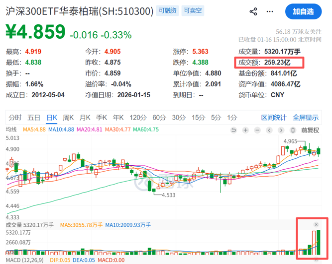 沪深300ETF华泰柏瑞成交额接近260亿元。