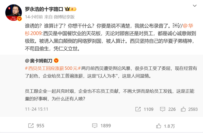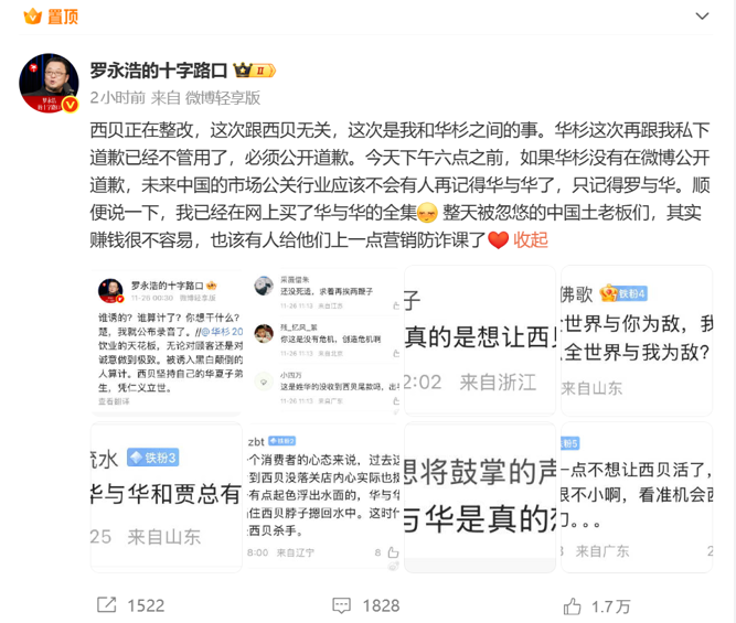 11月26日中午,事件再度升级。罗永浩发布微博表示,“西贝正在整改,这次跟西贝无关,这次是我和华杉之间的事。华杉这次再跟我私下道歉已经不管用了,必须公开道歉。”