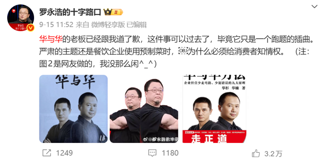 不过,9月15日,罗永浩在微博发文称:“华与华的老板已经跟我道了歉,这件事可以过去了,毕竟它只是一个跑题的插曲。”