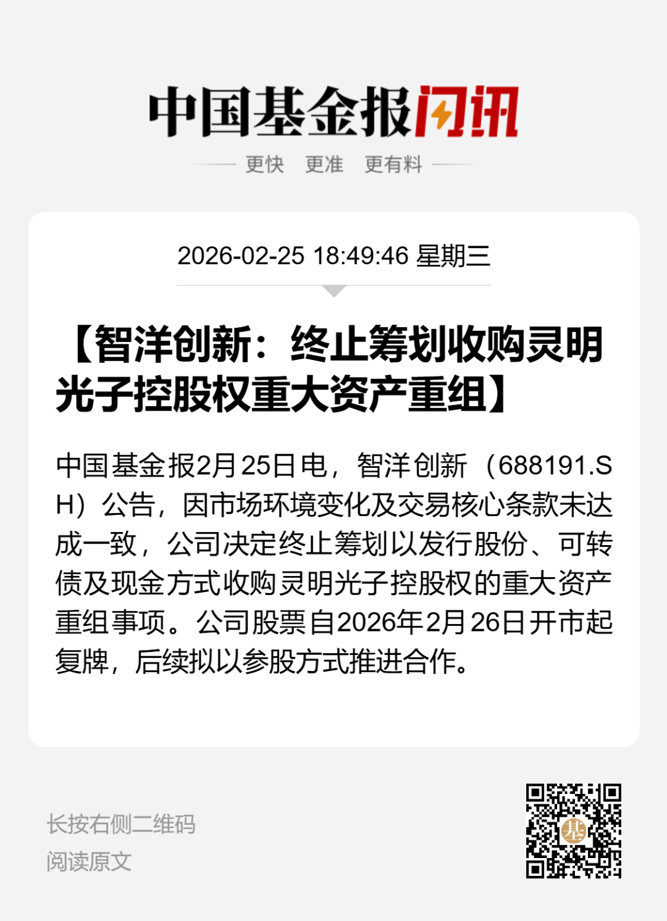 2月25日,智洋创新与灵明光子签署《战略投资意向协议》,约定智洋创新终止以发行股票及/或可转换公司债券、现金(如有)等方式收购灵明光子股权的相关交易。