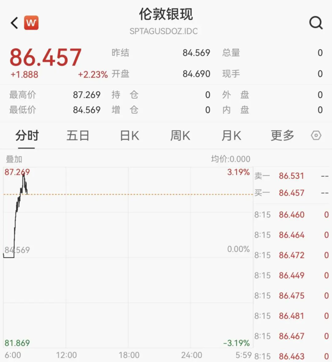 2月23日,现货白银一度涨超3%,现报86.46美元/盎司。